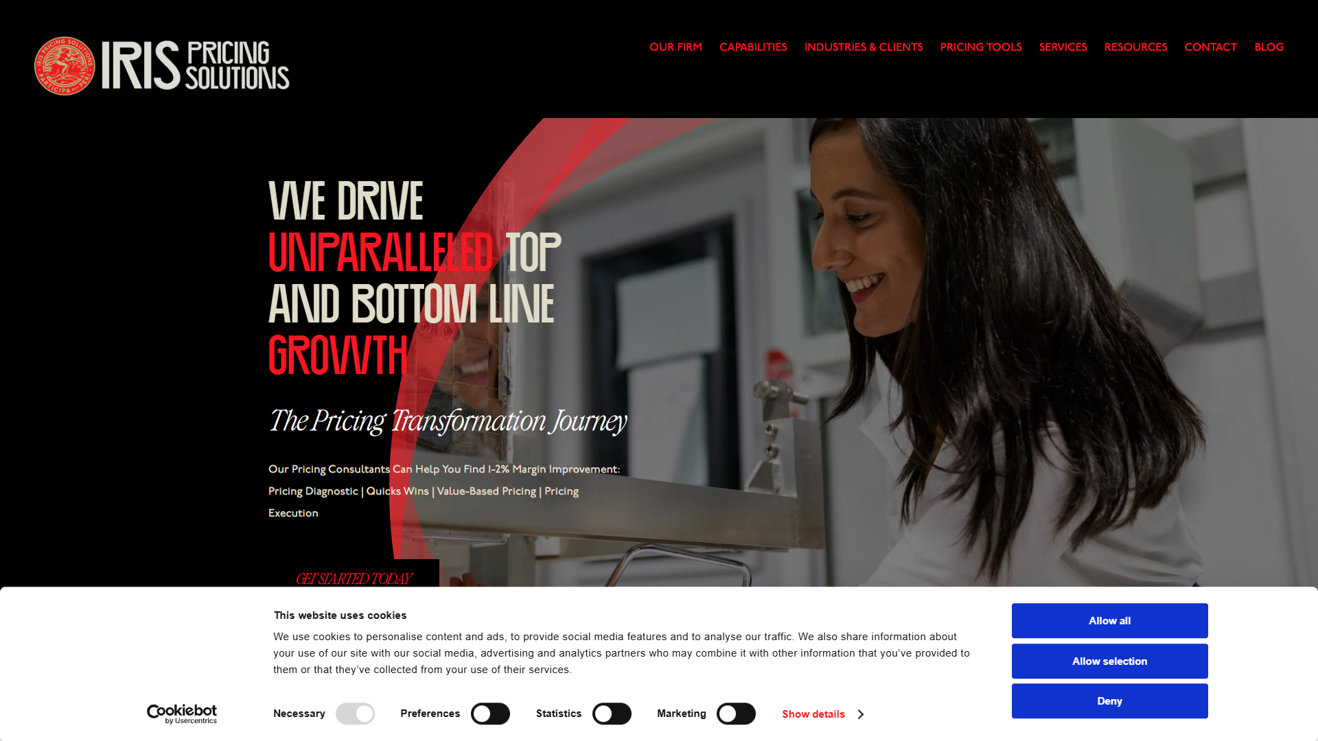 A comprehensive digital solution for Iris Pricing Solutions that revolutionizes how they serve their business consulting clients. Website for renowned global consulting firm specializing in pricing strategy and revenue management. Helps businesses optimize pricing practices with tailored solutions. Expertise includes pricing strategy development, value-based pricing, price optimization and analytics, pricing process improvement, training and capability building.